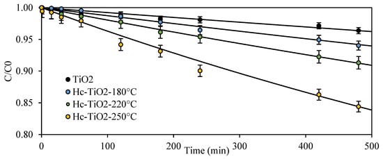 Table 2 lists the parameters obtained by fitting the degradation kinetics of Figure 5 to the second-order models. According to the k parameter, the photodegradation of TiO2 improved with the presence of Hc and with an increase in the synthesis temperature, and the photodegradation rate improved by up to 400% when Hc-TiO2-250 °C was used instead of TiO2.
