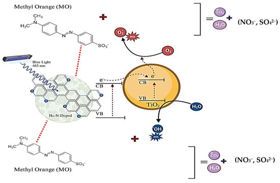 Proposed mechanism for MO photocatalysis using Hc-TiO2-based catalysts under visible light (465 nm).