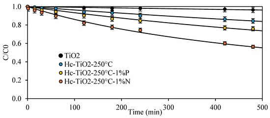 Table 3 lists the parameters obtained by fitting the degradation kinetics from Figure 7 to the second-order models. Based on the k parameter, the photodegradation capacity of HC-TiO2-250 °C in the presence of N-donor was significantly improved, achieving photodegradation rate increases of up to 2700% when Hc-TiO2-250 °C-1%N was used instead of TiO2. That is, the use of N-doped composites (Hc-TiO2-250 °C-1%N) improved the photocatalytic capacity of TiO2 seven times more than its un-doped analogues (Hc-TiO2-250 °C).
