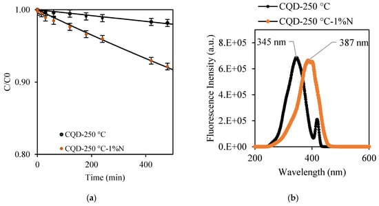 The CQDs co-produced during the synthesis of Hc-TiO2-250 °C and Hc-TiO2-250 °C-1%N were isolated and their photodegradation capacity at 465 nm was evaluated. The maximum photodegradation in the presence of CQD-250 °C and CQD-250 °C-1%N at 400 mg/L was 1.8 and 7.9%, respectively (Figure 9a). The incorporation of nitrogen into the CQD structure enhanced its photocatalytic activity. This improvement can be attributed to the greater excitation of CQD-250 °C-1%N compared to CQD-250 °C in the visible region, as evidenced by the fluorescence spectra (Figure 9b). The maximum excitation wavelength for CQD-250 °C was observed at 345 nm, while for CQD-250 °C-1%N, it shifted to 387 nm. This redshift allowed for more effective utilization of blue light during photocatalysis with CQD-250 °C-1%N, and resulted in an approximately 0.06 EJ reduction in excitation energy—an 11% decrease—based on Planck’s energy equation.