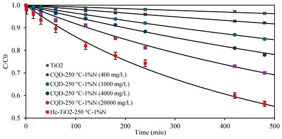 However, the photocatalytic performance of CQD-250 °C-1%N was lower than those obtained for the co-product Hc-TiO2-250 °C-1%N, which may be due to the concentration of the photocatalysts used, 400 mg/L vs. 2427 mg/L, and the carbon–Ti synergy of the Hc-TiO2 composite. To review the first hypothesis, photocatalytic tests were carried out at higher concentrations of CQD-250 °C-1%N, between 400 and 20,000 mg/L, and the results are shown in Figure 10.