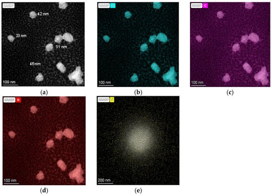 The proposed hydrothermal synthesis protocol allowed the chemisorption of TiO2 on the hydrochar structure but not on the CQDs. Figure 11 shows the HR-TEM elemental mapping images for CQD-250 °C-1%N. The results revealed the occurrence of various atoms, including carbon (violet), oxygen (cyan), and N (red) on the CQDs nanoparticles; however, the TiO2 mapping image did not reveal the presence of Ti (yellow) chemisorbed onto the CQD nanostructures, as was observed for the other atoms; instead, the atoms were dispersed throughout the field of view.
