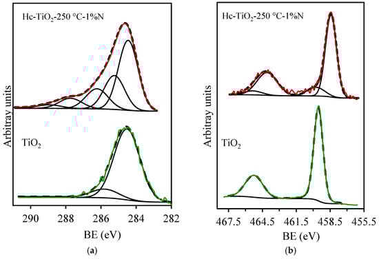 Finally, the superiority of Hc-TiO2-250 °C-1%N during photocatalysis can also be explained. Figure 12 shows the surface composition of this photocatalyst obtained by XPS. The results display the C1s region for TiO2 and Hc-TiO2-250 °C-N samples. The peak at 284.6 eV was assigned to the C-C bond and used as an internal reference to correct the binding energy shift. The peaks at higher binding energies were attributed to the presence of oxygen-containing surface groups. In the TiO2 sample, the detected C peak in the spectrum was attributed to the adventitious carbon atoms adsorbed on the TiO2 surface. However, a better-defined region was observed in the Hc-TiO2-250 °C-1%N sample due to the presence of the hydrochar. The Ti2p spectral region (Figure 12b) of the TiO2 sample presents only one component at BE = 459.6 eV, corresponding to Ti4+, in agreement with previously published BE values []. However, in the case of the Hc-TiO2-250 °C-N sample, two peaks are observed: the first one, at 459.6 eV, corresponds to Ti4+, and the peak at 458.4 eV is assigned to Ti3+. Note that 85.7% of surface titania is in a 3+ oxidation state, indicating the highly defective nature of the titania surface in the Hc-TiO2-250 °C-1%N sample, as has been proposed. The high content of Ti3+ or oxygen vacancies on the titania surface could explain the significant decrease in the bandgap in this sample and, consequently, the better photoactivity.