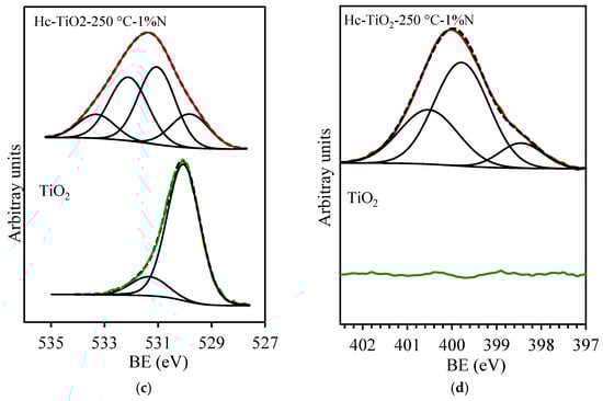 On the other hand, the peaks at 532.4 and 533.6 eV correspond to the oxygenated surface groups of the carbon phase, which are assigned, respectively, to C=O and C-O bonds. Finally, the N1s region is depicted in Figure 11d. Note that N was not detected in the TiO2 sample, whereas up to 4 wt.% was detected in the Hc-TiO2-250 °C-1%N sample, denoting its high surface N-doping content. Three components, at 598.4, 399.8 and 400.5 eV, were used to fit the N1s spectral region attributed to Pyridinic, Pyrrolic and graphitic N-groups anchored on the carbon surface. It has also been also reported that the XPS peaks at 396–397 eV are due to substitutional N-atoms, and those that appear at approximately 400 eV are generally ascribed to interstitial nitrogen in TiO2 [,]. In our work, peaks detected at 398.4 and 399.8 eV can also be attributed to the substitutional and interstitial states of nitrogen. Therefore, N-doping of TiO2 could occur in the hydrochar-based materials, which could explain the highly defective surface and the performance of Hc-TiO2-250 °C-1%N.
