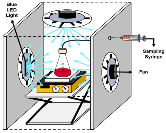 The performance during the degradation of Methyl Orange (MO) under visible-light irradiation at 30 °C was evaluated in a reaction system composed of a borosilicate glass reactor, a sampling syringe, and two power LEDs (Blue LED light at 465 nm, electric power of 50 W and 4080 lumen/W) coupled with fan devices located above and on the sides of the glass reactor [] as shown in Figure 13. The pH of the MO solutions was adjusted to 7 using NaOH (0.01 N) and HCl (0.01 N) solutions before the assay.