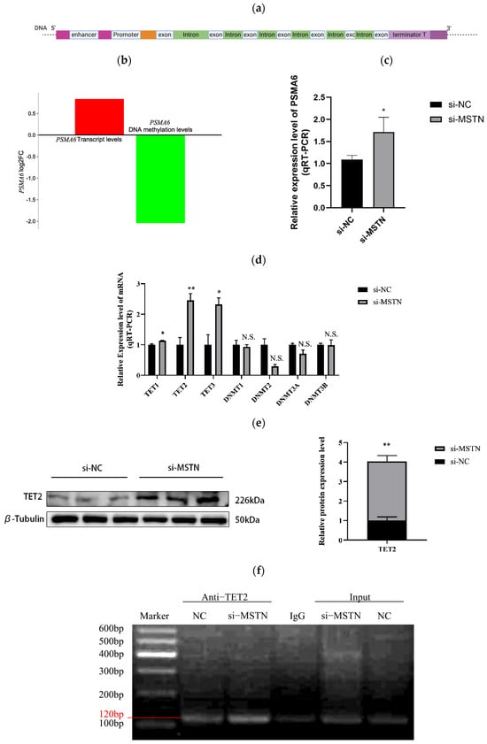 MSTN negatively regulates the PSMA6 gene: (a) Schematic representation of the PSMA6 gene structure (simplified illustration of exon–intron organization and Promoter). Promoter region: Chr12: 55,429,093–55,431,093, GRCh39. (b) Fold-difference plot of PSMA6 gene transcriptome and methylation sequencing data. (c) qRT-PCR results of PSMA6 at mRNA levels after knockdown of MSTN. (d) qRT−PCR results of mRNA levels for DNMTs and TETs family genes after MSTN interference. (e) Western blot was used to detect the expression of the TET2 protein. (f) ChIP validation of PSMA6 gene promoter region binding demethylase 2 (TET2). The IgG group served as the negative control, whereas the Input group functioned as the positive control. si−MSTN represents MSTN−interfered cell samples; si−NC denotes the non-targeting control group (negative control without RNA interference). “**” indicates that the difference is extremely significant (p < 0.01), “*” indicates that the difference is significant (p < 0.05), and “N.S.” indicates that the difference is not significant (p > 0.05).