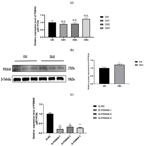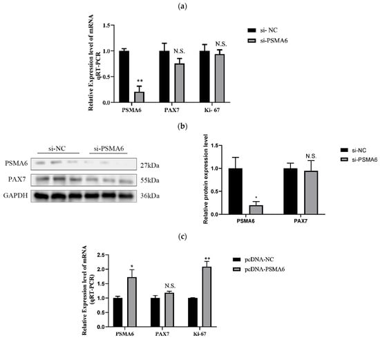 PSMA6 gene expression level and PSMA6 inhibition cell model construction: (a) qRT-PCR was used to detect the timing expression of PSMA6 mRNA in bovine skeletal muscle satellite cells during the proliferation and differentiation stages; (b) Western blot was used to detect the expression level of PSMA6 protein and the results of Western blot quantification of PSMA6 protein; (c) qRT-PCR results of mRNA levels of the PSMA6 gene after three si-RNAs were transfected into bovine skeletal muscle satellite cells for 24 h. “**” indicates that the difference is extremely significant (p < 0.01), “*” indicates that the difference is significant (p < 0.05), and “N.S.” indicates that the difference is not significant (p > 0.05).