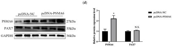 Effect of interference and overexpression of PSMA6 on the proliferation of bovine skeletal muscle satellite cells: (a) alteration of mRNA-level proliferation marker factors following disruption of PSMA6 gene expression; (b) protein-level changes in proliferation marker factors following disruption of PSMA6 gene expression; (c) proliferation marker factor changes at the mRNA level following PSMA6 gene overexpression; (d) following PSMA6 gene overexpression, the proliferation marker factor’s appearance varies at the protein level. si-PSMA6 denotes the PSMA6-silenced cell sample group (with RNA interference targeting PSMA6), while si-NC represents the non-targeting control group (negative control without RNA interference). pcDNA-PSMA6 indicates the PSMA6-overexpressing cell sample group (with ectopic PSMA6 expression), and pcDNA-NC corresponds to the empty vector control group (without exogenous gene overexpression). “**” indicates that the difference is extremely significant (p < 0.01), “*” indicates that the difference is significant (p < 0.05), and “N.S.” indicates that the difference is not significant (p > 0.05).