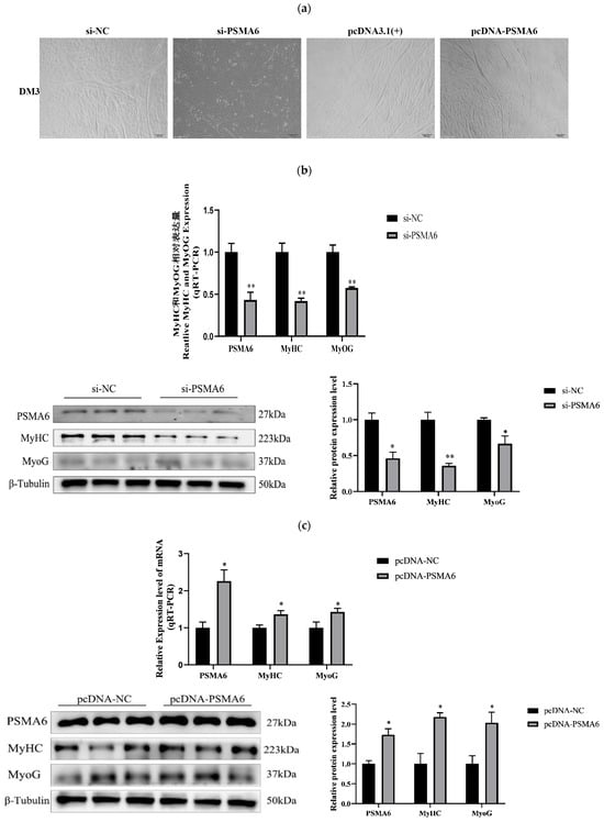 Effect of interference and overexpression of PSMA6 on the differentiation of bovine skeletal muscle satellite cells: (a) plot of cell differentiation development using light microscopy following PSMA6 gene inhibition and overexpression (100×); (b) following PSMA6 expression interference, the differentiation marker factors MyHc and Myog are expressed at the mRNA and protein levels; (c) following PSMA6 overexpression, the differentiation marker factors MyHc and Myog are expressed at the mRNA and protein levels. si-PSMA6 denotes the PSMA6-silenced cell sample group (with RNA interference targeting PSMA6), while si-NC represents the non-targeting control group (negative control without RNA interference). pcDNA-PSMA6 indicates the PSMA6-overexpressing cell sample group (with ectopic PSMA6 expression), and pcDNA-NC corresponds to the empty vector control group (without exogenous gene overexpression). “**” indicates that the difference is extremely significant (p < 0.01), “*” indicates that the difference is significant (p < 0.05).