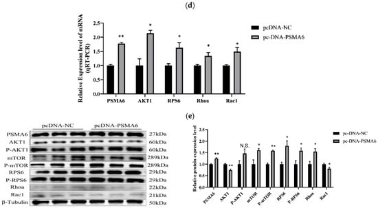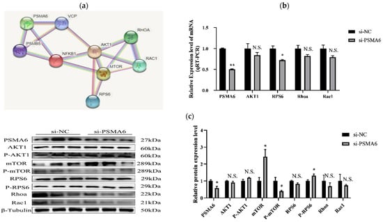 Effects of interference and overexpression of PSMA6 on the AKT/mTOR pathway: (a) STRING predicts the interaction of the PSMA6 protein with key proteins in the AKT/mTOR pathway; (b) detection of key genes in the AKT/mTOR pathway by qRT-PCR at the mRNA transcriptional level after PSMA6 interference; (c) Western blot analysis was performed after PSMA6 interference to detect the expression of key proteins in the AKT/mTOR pathway; (d) key genes in the AKT/mTOR pathway were identified through qRT-PCR analysis of mRNA transcription levels following PSMA6 overexpression; (e) Western blot was utilized to detect the expression of key proteins in the AKT/mTOR pathway following PSMA6 overexpression. si-PSMA6 denotes the PSMA6-silenced cell sample group (with RNA interference targeting PSMA6), while si-NC represents the non-targeting control group (negative control without RNA interference). pcDNA-PSMA6 indicates the PSMA6-overexpressing cell sample group (with ectopic PSMA6 expression), and pcDNA-NC corresponds to the empty vector control group (without exogenous gene overexpression). “**” indicates that the difference is extremely significant (p < 0.01), “*” indicates that the difference is significant (p < 0.05), and “N.S.” indicates that the difference is not significant (p > 0.05).