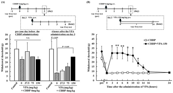 Dose–response effects and temporal changes after a single administration of VPA on CDDP-induced mechanical allodynia in rats. (A) CDDP (4 mg/kg) was intravenously administered at 5:00 on day 0, with saline administered to the control group. VPA (75, 150, or 300 mg/kg/day) was orally administered at 8:00 on day 3, and the von Frey test was performed on days −1 and 3. Each value represents the mean and standard error (SEM; n = 4). (B) CDDP (4 mg/kg) was intravenously administered at 5:00 on day 0, and VPA (150 mg/kg) was orally administered at 8:00 on day 3. The von Frey test was performed 2, 4, 6, 8, 10, 12, 14, 16, and 24 h after the VPA administration. Each value represents the mean and SEM (n = 6). *: p < 0.05, **: p < 0.01, N.S. means not significant among all groups. CDDP, cisplatin (cis-diamminedichloro-platinum); VPA, valproic acid.
