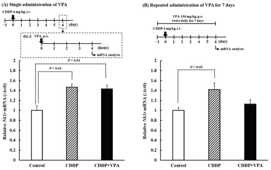 Neurokinin 1 receptor (NK1R) reportedly plays a role in chronic pain, including mechanical allodynia [28,29]. Accordingly, we detected expression levels of Nk1r mRNA on day 6 after single or repeated administration of VPA. Four hours after a single VPA administration, the CDD-only and CDDP + VPA groups exhibited significantly higher Nk1r mRNA expression levels than the control group (p < 0.01; Figure 3A). However, 4 h after the final administration of repeated doses, the CDDP-only group exhibited significantly increased Nk1r mRNA expression compared with the control group (p < 0.05; Figure 3B). Upon repeated VPA administration, expression of Nk1r mRNA did not differ significantly between the control and CDDP + VPA groups.