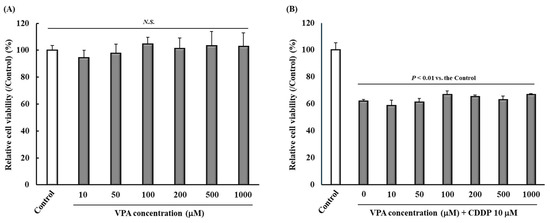 At concentrations of 10, 50, 100, 200, 500, and 1000 μM, VPA did not affect the viability of Walker 256 cells, a rat cell line derived from mammary carcinoma (Figure 5A). CDDP (10 μM) significantly reduced the viability of Walker 256 cells compared with the Control. However, there were no significant differences among groups administered CDDP (10 μM) plus each VPA concentration (Figure 5B).