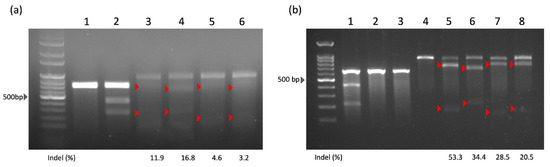 Figure 1. Surveyor assay results in iPSCs and HEK293T cells. (a) The Surveyor assay was per-formed to analyze the efficiency of designed sgRNAs in iPSCs. The lane assignments are as follows: 1. negative control; 2. positive control; 3. Cas9/sgRNA 1; 4. Cas9/sgRNA 2; 5. Cas9/sgRNA 3; 6. Cas9/sgRNA 4. (b) The Surveyor assay was also performed in HEK293T cells using the same set of designed sgRNAs. The lane assignments are as follows: 1. positive control; 2, 3. negative controls from G/C plasmids; 4. Cas9 mock plasmid; 5. Cas9/sgRNA1; 6. Cas9/sgRNA2; 7. Cas9/sgRNA3; 8. Cas9/sgRNA4. The red triangles indicate the cleavage products generated by the Surveyor assay.