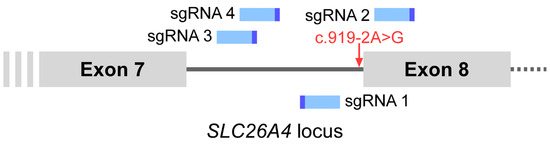 Figure 3. The candidate sgRNAs with putative targeting sites surrounding the SLC26A4 c.919-2A>G variant. The sgRNA is shown with a 5′ protospacer (light blue) and a 3′ PAM motif (indigo).