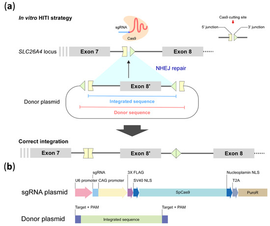 Next, as shown in Figure 4a, the HITI donor sequence consisting of the wild-type genomic segment over partial intron 7, entire exon 8, and partial intron 8 (chr7:107,323,848–107,325,735, 1888 bp) of SLC26A4 flanked by the reverse complement of the sgRNA sequence was constructed in the donor plasmid (middle panel). CRISPR homologous clipping would induce DSBs at 3 bp upstream of the PAM sites, allowing the sgRNA-targeted sequence to be split into 5′ and 3′ junction segments (top panel) in both the targeted genome and donor plasmid. The “integrated sequence” segment would be clipped from the donor plasmid and inserted into the junction site on the target genome via NHEJ-mediated repair (middle panel), resulting in the “correct integration” of the edited genome (bottom panel).