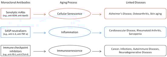 | Inflammaging | IL-6, IL-1β, TNF-α | Cytokine-neutralizing mAbs (e.g., Tocilizumab, Infliximab) | RA, CVD, sarcopenia | Approved in inflammatory disease | [47,48,49,50,51] |