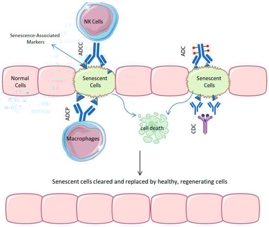 | ADCs | B2M, Senescent Cell Markers | Delivery of cytotoxic agents to induce apoptosis | Preclinical studies demonstrate senescent cell clearance and tissue rejuvenation. | [44] |