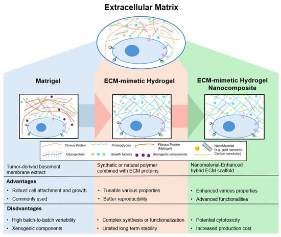 Synthetic ECM-mimetic hydrogels are indispensable platforms for replicating tissue-like environments in various biomedical applications [,,,,]. Therefore, many researchers have focused on overcoming the disadvantages of Matrigel [,,]. Such approaches can be classified into two categories: ECM-mimetic hydrogel and ECM-mimetic hydrogel nanocomposite [,]. Both approaches share the common goal of mimicking the native ECM but differ in their design strategies and functionalities [].