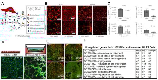 Synthetic ECM-mimetic hydrogels offer a well-defined and reproducible platform for modeling vascular networks, addressing the major limitations associated with Matrigel. In a study by Lee et al. [], a PEG hydrogel was engineered to present with controlled biochemical ligands and mechanical properties. The system is composed of independently tunable components (e.g., RGD cell adhesion peptides, VEGF-binding peptides, matrix metalloproteinase (MMP)-degradable crosslinkers, and PEG-based polymer backbones) that allow for the precise modulation of cell–matrix interactions, stiffness, and degradability (Figure 2A) [,,]. A comparative analysis showed that the studied ECM-mimetic hydrogel supported superior endothelial network formation compared to those formed in Matrigel. Unlike Matrigel, which suffers from undefined composition and xenogeneic origin, the ECM-mimetic hydrogel system enables controlled presentation of adhesion motifs and matrix mechanics, leading to more standardized outcomes []. Moreover, the platform demonstrated broad applicability across multiple endothelial cell types, including both primary human umbilical vein endothelial cells (HUVECs) and induced pluripotent stem-cell-derived endothelial cells (iPSC-ECs), which supports its versatility for various vascular models.