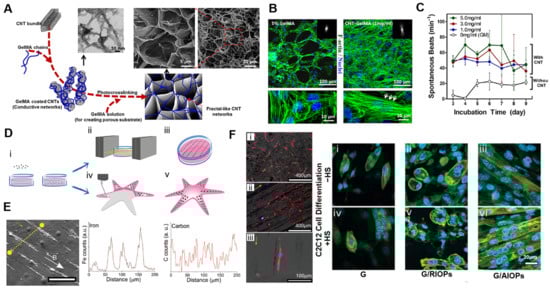 To expand the functional capabilities of ECM-mimetic hydrogels, nanomaterial integration has emerged as a key strategy. To improve the electrical and mechanical performance of cardiac tissue scaffolds, Shin et al. [] incorporated carbon nanotubes (CNTs) into gelatin methacrylate (GelMA) hydrogels. Carbon nanotubes provided the hydrogels with electromagnetic networks and enhanced mechanical strength, thereby improving cardiomyocyte alignment, electrical coupling, and synchronous beating behavior. Notably, the CNT-GelMA matrix supported electrical stimulation, lowering the excitation threshold and enabling synchronized contractility of cardiomyocytes under external electrical cues. This approach resulted in a conductive and stiffened matrix that mimics the fibrous nature of native cardiac ECM (Figure 3A). As a result, the CNT-GelMA hydrogel promoted the alignment and elongation of cardiomyocytes with well-organized sarcomeric structures (Figure 3B), in contrast to the disorganized growth seen on pristine GelMA hydrogels []. The engineered tissues also showed enhanced beating activity and improved connectivity (Figure 3C), highlighting the role of CNTs in supporting functional maturation. Overall, this ECM-mimetic hydrogel nanocomposite system demonstrates how conductive nanomaterials can introduce tissue-specific functionalities and support the development of contractile and responsive characteristics in cardiac tissues [].