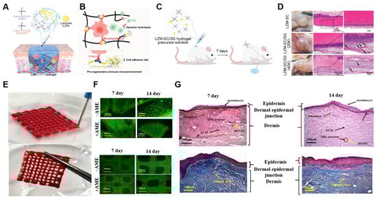 Application of ECM-mimetic hydrogels on tissue engineering. (A) Schematic illustration of the composition of the LZM-SC/SS hydrogel. (B) Mechanism of immune modulation by ECM-mimetic hydrogel. (C) Subcutaneous injection of the LZM-SC/SS hydrogel. (D) Histological evidence of macrophage polarization and angiogenesis (black arrows) after injection of the hydrogel. Reproduced with permission from []. (E) Three-dimensional bioprinting of the bilayered GelMA/gelatin hydrogel scaffold. (F) Effect of AME on cell viability within the scaffold. (G) Histological assessment of epidermal–dermal stratification and ECM formation. Reproduced with permission from [].