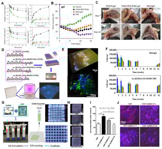 Application of ECM-mimetic hydrogel nanocomposite on tissue engineering. (A) Adsorption and release profiles of FITC-labeled ECM components (collagen and heparin) in PLGA-PEG-PLGA/LAPONITE® ECM-mimetic hydrogel nanocomposite compared to control gels. (B) Quantitative analysis of muscle function recovery. Green: P3L0.9, White: Laponite, Black: PLGA-PEG-PLGA. (C) Macroscopic evaluation of muscle regeneration over time period in vivo. Reproduced with permission from []. (D) Schematic illustration for fabrication of self-assembling peptide hydrogel. (E) Three-dimensional confocal imaging of differentiated neural cells within the peptide hydrogel (top) 3D confocal imaging of differentiated neural cells within the peptide hydrogel (bottom). (F) Time-dependent differentiation profiles of neural stem cells encapsulated in functionalized peptide hydrogels. Colorcode: neuralprogenitorcells (blue), neurons (green), astrocytes (orange), and oligodendrocytes (brown). Reproduced with permission from []. (G) Formulation and 3D printing of CNF/GelMA ECM-mimetic hydrogel nanocomposite. (H) Effect of CNF/GelMA ratio on scaffold fidelity. (I) Mechanical analysis of printed CNF/GelMA scaffolds. (J) Cell viability and morphology within CNF/GelMA scaffolds. Reproduced from [].