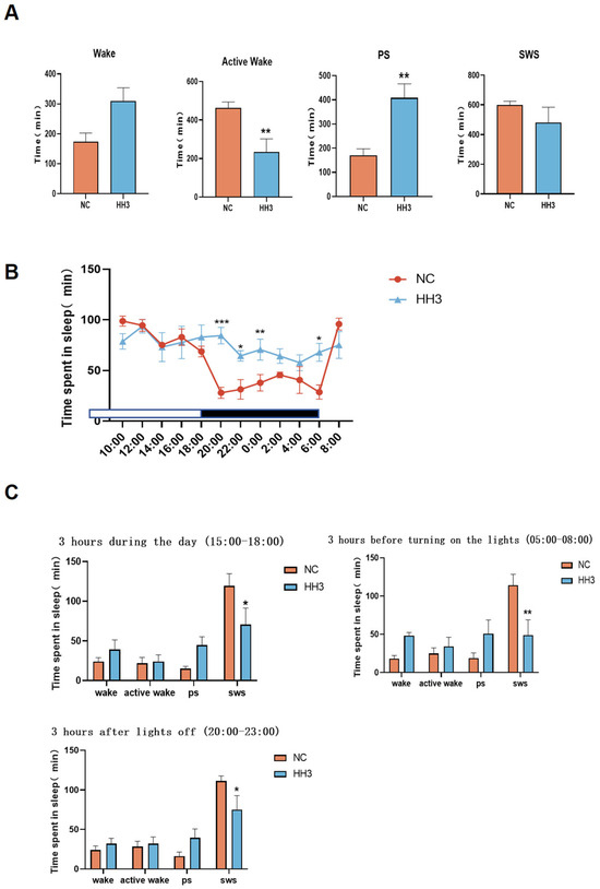 To further characterize awakening changes, we analyzed the sleep–wake characteristics of rats during three different 3 h periods: 15:00–18:00 (daytime), 20:00–23:00 (early dark phase), and 05:00–08:00 (early light phase). The results showed that paradoxical sleep duration increased in all three time periods in the 3-day hypoxia group, whereas slow-wave sleep duration significantly decreased (p < 0.05) (Figure 2C), with the most pronounced changes observed in the early light phase (p < 0.01). These findings suggest that, compared to the NC group, the HH3 group exhibited significantly reduced deep sleep, increased wakefulness, and an overall decline in sleep–wake quality.