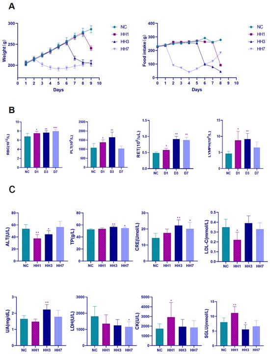 During the experiment, the body weight and food intake of the rats were recorded daily. After successful model establishment, the rats were anesthetized via intraperitoneal injection of 3% sodium pentobarbital (45 mg/kg) at 8 p.m., and whole blood samples were collected from the abdominal aorta. A portion of the blood was stored in anticoagulant tubes for hematological analysis, while the remainder was placed in non-anticoagulant tubes for biochemical assays. The non-anticoagulated blood samples were stored at 4 °C for 30 min and centrifuged at 1500 rpm for 15 min at 4 °C, and the resulting serum was collected and stored at −80 °C. Hematological parameters were measured using a hematology analyzer (XN-1000V, Sysmex, Kobe, Japan), while serum biochemical indices were analyzed using an automated biochemical analyzer (Cobas C 311, Roche, Mannheim, Germany).