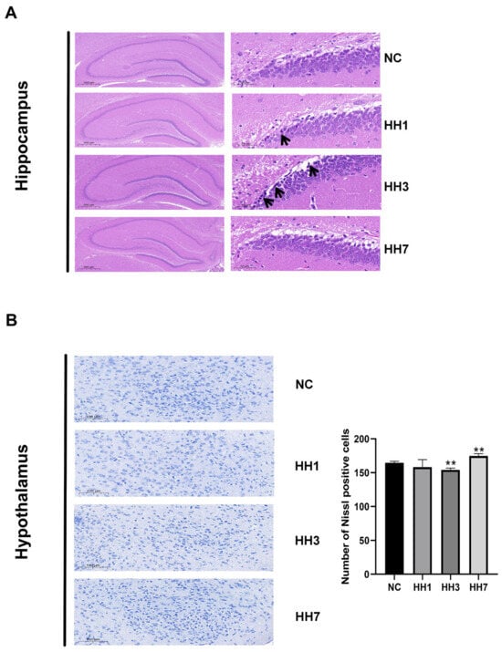 Effects of different hypoxic models on hippocampal and hypothalamic pathology in rats. (A) Hippocampal dentate gyrus (DG) region (2×, 20× magnification). Arrows indicate neuronal collapse. (B) Nissl staining of hypothalamic tissue (10× magnification). ** p < 0.01 vs. control group.