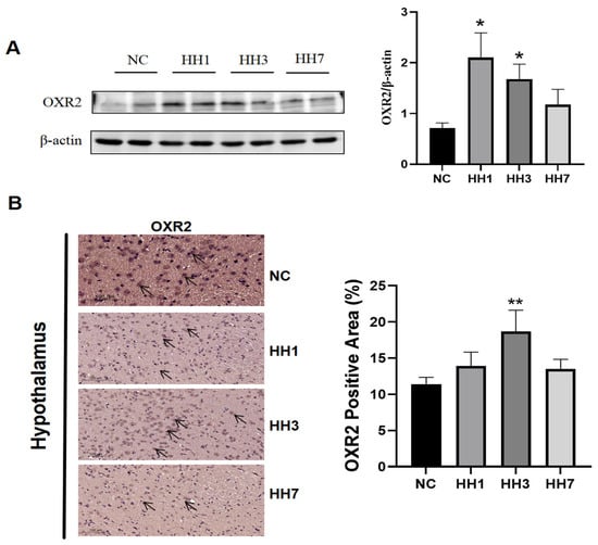 Effect of different hypobaric hypoxia durations of exposure on the orexin system. (A) Relative expression levels of OXR2 protein in hypothalamic tissues by Western blotting; (B) Immunohistochemical staining results for OXR2 in the hypothalamus. * p < 0.05, ** p < 0.01 vs. NC group.