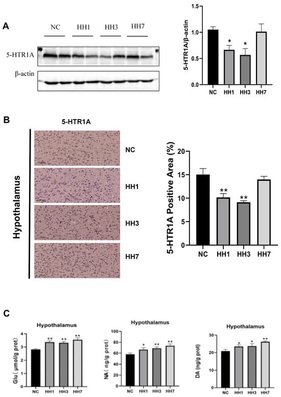 5-hydroxytryptamine receptor 1A (5-HTR1A) modulates serotonin (5-HT) release and signal transduction, which affects the sleep–wake cycle. Disruptions in serotonin signaling can lead to heightened wakefulness and impaired sleep. To investigate this, we assessed hypothalamic 5-HTR1A protein expression using WB and immunohistochemical staining. Alterations in the concentrations of other neurotransmitters were quantitatively analyzed using enzyme-linked ELISA. As shown in Figure 8, the WB results indicated that 5-HTR1A protein levels were significantly decreased in the hypoxia model groups compared to the control group (p < 0.05, Figure 8A). Immunohistochemical staining further showed that the area of 5-HTR1A positive staining in the hypoxia group was significantly reduced (p < 0.05, Figure 8B). The expression levels of Glu, NA, DA, and other related arousal neurotransmitters were significantly increased (p < 0.01, p < 0.05, Figure 8C). These findings suggest that hypobaric hypoxia may impair sleep by downregulating 5-HTR1A in the hypothalamus and increasing the expression of pro-wakefulness-related neurotransmitters.