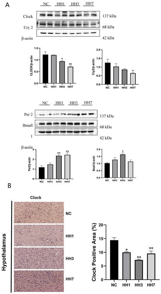 Effects of different durations of hypobaric and hypoxic exposure on the expression of hypothalamic circadian rhythm-related proteins. (A) Expression of circadian rhythm-related proteins and hypothalamic clock proteins. (B) Immunohistochemical staining results for CLOCK in the hypothalamus. * p < 0.05, ** p < 0.01 vs. NC group.