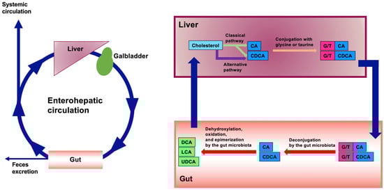 The enterohepatic circulation of bile acids (BAs). BAs are primarily synthesized in the liver from cholesterol through the classical pathway and the alternative pathway. In the classical pathway, the primary BAs, cholic acid (CA) and chenodeoxycholic acid (CDCA), are synthesized. In the alternative pathway, CDCA is synthesized. CA and CDCA are conjugated with glycine or taurine. These BAs are then stored in the gallbladder and secreted into the small intestine upon food intake. Conjugated CA and CDCA are deconjugated by intestinal bacterial bile salt hydrolase. The deconjugated CA and CDCA are then converted by intestinal bacteria to various BAs, such as DCA, LCA, and UDCA. Most BAs absorbed from the intestine are transported to the liver. However, some enter the systemic circulation. BAs that are not absorbed from the intestine are excreted as feces.