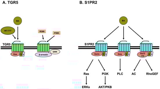 Takeda G-protein receptor 5 (TGR5) and sphingosine-1 phosphate receptor 2 (S1PR2). (A) TGR5 primarily couples with Gαs, leading to an increase in intracellular cyclic AMP (cAMP) concentration through the activation of adenylate cyclase by Gαs. LCA, DCA, CDCA, and CA. Furthermore, the taurine- or glycine-conjugated forms of these bile acids (BAs) activate TGR5. INT-777, a BA derivative that also activates TGR5. The synthetic agonists, P395 and R399, activate TGR5, which in turn activates GPCR-related kinase (GRK), leading to the activation of β-arrestin. (B) S1PR2 is associated with Gαi/o, Gαq/11, and Gα12/13. The activation of Gαi/o leads to the activation of phosphoinositide 3-kinase (PI3K) and Ras. PI3K activates AKT/PKB. The activation of Ras leads to the activation of extracellular signal-regulated kinases (ERKs). The activation of Gαq/11 leads to the activation of phospholipase C (PLC). The activation of Gα12/13 leads to the activation of adenylate cyclase (AC) and Rho guanine nucleotide exchange factors (RhoGEF). TCA, TDCA, GCA, GDCA, and TUDCA are able to activate ERK and AKT/PKB through S1PR2. In contrast, TβMCA inhibits the activation of AKT/PKB and ERK.