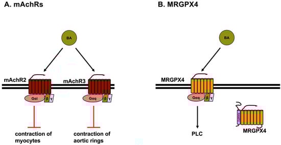 Muscarinic Acetylcholine Receptors (mAChRs) and Mas-related, G-protein-coupled receptor X4 (MRGPRX4) with receptor activity-modifying protein 2 (RAMP2). (A) mAChR M2 couples with Gαi, whereas mAChR M3 couples with Gαq. TCA, TCDCA, TDCA, and GDCA reduce the contraction of myocytes via mAChR M2. TDCA attenuates phenylephrine-induced contraction in aortic rings via mAChR M3. (B) MRGPRX4 couples with Gαq and the activation of MRGPRX4 by DCA, TDCA, UDCA, CDCA, TCDA, and CA leads to the activation of phospholipase C (PLC) and Ca2+ release. MRGPRX4 can associate with RAMP2, which significantly decreases the cell surface expression of MRGPRX4.