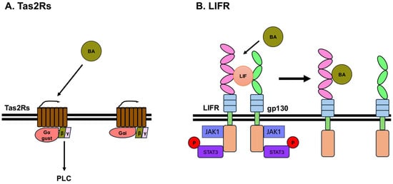 Taste receptor type 2 (TAS2Rs) and LIFR with gp130. (A) The activation of TAS2R leads to the dissociation of Gα-gustducin from βγ-subunit. The dissociated βγ-subunit activates phospholipase C (PLC), leading to the release of Ca2+. CA, TCA, GCA, LCA, TLCA, DCA, CDCA, and UDCA activate five human bitter receptors, namely TAS2R1, TAS2R4, TAS2R14, TAS2R39, and TAS2R46, and five mouse bitter receptors, namely mTas2R105, mTas2R108, mTas2R123, mTas2R126, and mTas2R144. (B) LIF interacts with LIFR at D3 and D4 and with gp130 at D2 and D3. DCA, TDCA, GDCA, 3-oxoDCA, LCA, T LCA, GLCA, and 3-oxoLCA act as antagonists against the binding of LIFR with LIF. These bile acids inhibit the association between LIF and LIFR by binding to the D3 region of LIFR.