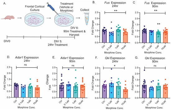 Previously, we reported significant upregulation of 76 circRNAs in the OFC, a subregion of the frontal cortex, following 10 days of chronic heroin SA in adult male and female rats []. Upregulated circRNAs included circGrin2b, an exonic circRNA containing 599 nucleotides (nt) derived from exon 3 of Grin2b (Supplementary Figure S1). Although several enzymes have been linked to circRNA biogenesis, the circRNA substrates of each enzyme have not been fully described. Moreover, the splicing enzyme(s) responsible for circGrin2b biogenesis are currently unknown. To begin to elucidate the potential mechanisms regulating opioid-induced circGrin2b biogenesis, we examined the expression of three splicing factors known to be involved in circRNA splicing [,,,,], in cortical cultures at two timepoints following exposure to three different concentrations of the opioid morphine. Primary frontal cortex cells were isolated from post-natal day one (PN1) rat pups and cultured for five days prior to treatment. Cortical cultures were treated with 0.1 µM, 1µM, or 10 µM morphine, or vehicle, for 24 h, or 90 min. 24 h cortical cultures were treated on DIV5, and 90 min cortical cultures were treated on DIV 6 (Figure 1A). Following cell harvest, mRNA expression of Fused in Sarcoma (Fus), Adenosine deaminase acting on RNA 1 (Adar1), and Quaking (Qki) were measured with qPCR. Fus was significantly downregulated in primary cortical cultures following both 24 h and 90 min of morphine exposure (one-way ANOVA 24 h: F (3, 42) = 4.877, p = 0.0053; Kruskal–Wallis 90 min: p = 0.0072; Figure 1B,C). Post hoc tests revealed significant downregulation of Fus in 24 h 0.1 µM and 90 min 1 µM treated cortical cultures compared to vehicle (Dunnett’s post hoc test: 24 h 0.1 µM p = 0.0279; Dunn’s post hoc test: 90 min 1 µM p = 0.0037; Figure 1B,C). Morphine treatment did not significantly alter the expression of Adar1 at either 24 h or 90 min timepoints (Kruskal–Wallis 24 h: p = 0.1034; one-way ANOVA 90 min: F (3, 53) = 0.6047, p = 0.6149; Figure 1D,E). Qki expression was significantly altered following 24 h morphine exposure but not 90 min (Kruskal–Wallis, 24 h: p = 0.0500; 90 min: p = 0.6137; Figure 1F,G). However, post hoc tests did not reveal significant differences between vehicle and morphine treated groups for Qki after 24 h morphine exposure. We conclude that acute morphine exposure can significantly downregulate expression of Fus, a potential negative regulator of circRNA biogenesis [].
