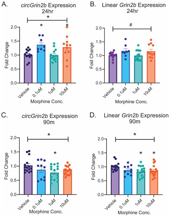 Morphine exposure regulates expression of circGrin2b in primary cortical cultures. (A–D) Expression of circGrin2b (A,C) and linear Grin2b (B,D) at 24 h (A,B), or 90 min (C,D) after morphine exposure. Error bars indicate the standard error of the mean (SEM). * above the solid line indicates one-way ANOVA, p < 0.05. # above the solid line denotes one-way ANOVA p < 0.1 but p > 0.05; * directly above histogram indicate p < 0.05 versus vehicle post hoc test.