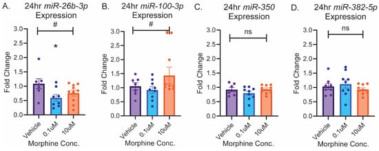 Morphine exposure regulates expression of miRNAs with putative circGrin2b binding sites. miRNA expression in primary cortical cultures following morphine treatment for miR-26b-3p (A), miR-100-3p (B), miR-350 (C), and miR-382-5p (D). Error bars indicate the standard error of the mean (SEM). # above the solid line denotes one-way ANOVA p < 0.1 but p > 0.05; * directly above histogram indicate p < 0.05 versus vehicle post hoc test. ns, not significant.