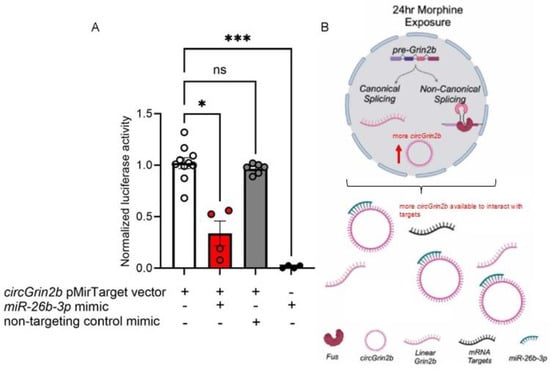circGrin2b sponges miR-26b-3p. (A) Relative luminescence values in HEK293T cells following co-transfection of circGrin2b pMirTarget vector, a miR-26b-3p mimic, or a non-targeting control mimic. Mimics alone were used as a negative control and did not produce chemiluminescence. (B) Proposed mechanisms for circGrin2b-mediated opioid-induced neuroadaptations. Following 24 h morphine exposure, an increase in circGrin2b expression results in an elevation of circGrin2b available to interact with other targets, such as miR-26b-3p. * p < 0.05, *** p < 0.001, ns, not significant.