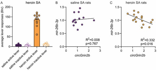 To determine if the observed in vitro relationship between circGrin2b and miR-26b-3p occurs in the mammalian brain, we returned to our animal model of heroin SA. We measured expression of miR-26b-3p in OFC tissue samples from male and female rats that underwent heroin SA, as we previously reported that circGrin2b was significantly upregulated in these samples []. Rats that received heroin quickly learned to distinguish between a drug-paired active lever, and an inactive lever that did not result in any programmed consequences (Figure 5A). Rats that received saline during SA did not distinguish between the two levers. Levels of circGrin2b were not correlated with miR-26b-3p in rats that self-administered saline (Figure 5B). Conversely, rats that self-administered heroin displayed a significant negative correlation between OFC expression of circGrin2b and miR-26b-3p (Pearson’s Correlation, R2 = 0.3320, p = 0.0155; Figure 5C). This data demonstrates that the in vitro relationship we reported is consistent and relevant within an in vivo model of opioid-exposure.