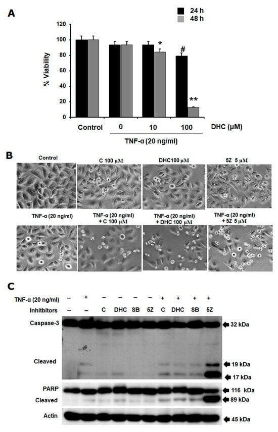 To test the effects of DHC on cancer cell viability, HeLa cells were treated with DHC with or without TNF-α 20 ng/mL. 24 and 48 h after the treatment, DHC significantly enhanced TNF-α-induced cancer cell death in a concentration-dependent manner, since the cytotoxicity at 48 h was higher than at 24 h (Figure 2A). Regarding the mode of cell death, we found that DHC enhanced TNF-α-induced cell death via the apoptosis pathway, indicated by cell morphology changes including cells shrinking, becoming smaller, and detaching from the culture surface after cells were treated with 100 µM DHC in the presence of TNF-α for 24 h compared with standard substances, including C, 5Z (5z-7-oxozeaenol, TAK1 inhibitor), and SB (SB 203580, p38 MAPK Inhibitor) (Figure 2B), which correlate with the presence of caspase-3 and poly (ADP-ribose) polymerase (PARP-1) cleavage (Figure 2C).