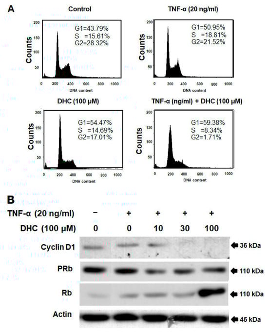 The impact of DHC on cancer cell cycle arrest caused by TNF. (A) DHC was pretreated in either the presence or absence of TNF-α 20 ng/mL for 12 h on HeLa cells. Cell cycle analysis was used to examine cell stages. (B) For 4 h, cells were exposed to DHC at several doses with or without TNF-α (20 ng/mL) present. Western blotting was used to separate the whole-cell extract and examine it using anti-phospho-RB, cyclin D1, RB, and actin antibodies. (+ with test compound, − without test compound).