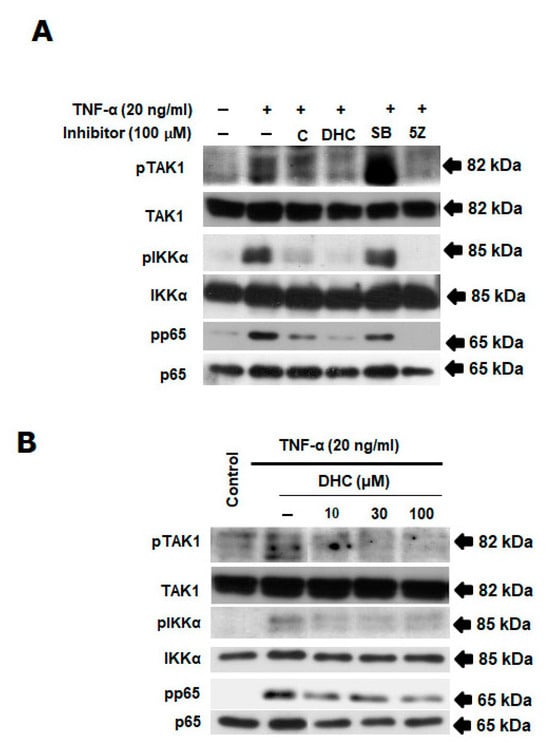 The HeLa cells were evaluated for the impact of DHC and C on TNF-α-induced NF-κB activation. Cells were incubated for 30 min with DHC, C, SB, and 5Z before being stimulated with TNF-α for 4 h. The TNF-α-triggered NF-κB pathway’s activation was examined using Western blot. Figure 4A,B shows that DHC inhibited the phosphorylation of TAK1, IKKα, and p65 in a concentration-dependent manner compared with the positive control (inhibitor of TAK1 and p65). These outcomes suggest that DHC inhibited TNF-α-induced TAK1-mediated NF-κB pathway’s activation.