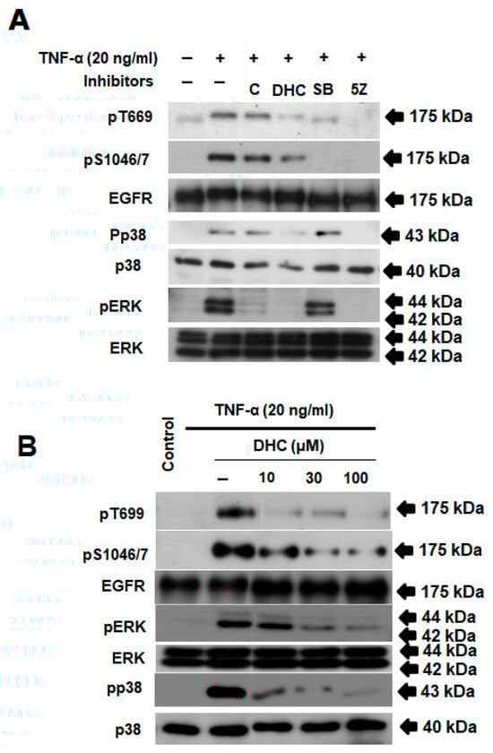 Additionally, we investigated DHC’s impact on the TAK1-mediated phosphorylation of the EGFR at Ser-1046/7 and Thr-669, pathways involved in TNF-α signaling that prevent apoptosis. Figure 5A,B demonstrate that DHC inhibited the phosphorylation of Ser-1046/7 and Thr-669 brought on by TNF-α. We have indicated that the p38 and ERK pathways, respectively, are involved in the phosphorylation of the EGFR at the Ser and Thr residues. This is related to the finding that DHC inhibited the stimulation of p38 and ERK in a concentration-dependent manner when compared to the positive control (inhibitor of TAK1 and p65) (Figure 4A,B).