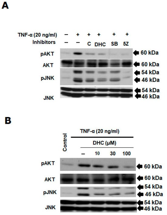 AKT and JNK are a kinase downstream of TAK1 in cancer cells. We used pharmacological inhibitors of TAK1 and p38 to further describe the activation of the TAK1-p38 pathway. When TNF-α-induced phospho-TAK1 was inhibited by the TAK1 inhibitors 5Z-7-oxozeaenol and SB203580, the phosphorylation of its downstream kinases, such as JNK and AKT, also decreased. DHC inhibited the phosphorylation of AKT and JNK in a concentration-dependent manner compared with the positive control (inhibitor of TAK1 and p65) (Figure 6A,B).
