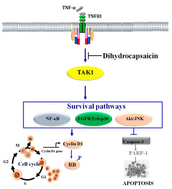 In this study, we demonstrated that dihydrocapsaicin (DHC), a major capsaicinoid found in red peppers, enhances tumor necrosis factor-α (TNF-α)-induced G1 cell cycle arrest and apoptosis in HeLa human cervical cancer cells through the suppression of TAK1-mediated NF-κB and EGFR survival pathways. These findings reveal novel mechanistic insights into the potential anticancer properties of DHC, expanding on prior evidence of capsaicinoid-mediated cytotoxicity toward cancer cells.