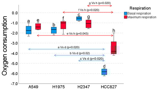 The lowest oxygen consumption was observed in the HCC827 cell line, with a median of −5.83, with statistically significant differences compared to the other cell lines (Figure 1). The highest oxygen consumption was shown in the H2347 cell line, with a median of −0.54 (p < 0.05 compared to the other cell lines). The two remaining cell lines (A549 and H1975) with similar medians (−1.75 and −1.65, respectively, p > 0.05) showed intermediate oxygen consumption. Regarding maximum oxygen consumption (via glutamate-malate ADP binding), the HCC827 cell line had the lowest oxygen consumption, with a median of −3.81 and statistically significant differences (Figure 1). The rest of the cell lines (A549, H1975, H2347) maintained consumption with similar medians (−1.40, −1.00, −1.07, respectively, p > 0.05).