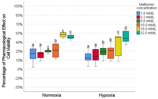 The effect of metformin on cell viability under normoxic and hypoxic conditions. Intragroup comparisons (between concentrations under the same oxygen conditions) were analyzed using the Wilcoxon test; statistical significance is represented by different letters above the bars (p < 0.05). Intergroup comparisons (the same concentration under normoxic vs. hypoxic conditions) were evaluated using the Mann–Whitney U test. The circles in the graph represent outliers identified during the analysis. Exact p-values for each statistical comparison are provided in the Supplementary Materials (Tables S1–S3). The Mann–Whitney U test revealed no statistically significant differences in cell viability between the same metformin concentrations when comparing normoxic and hypoxic conditions.